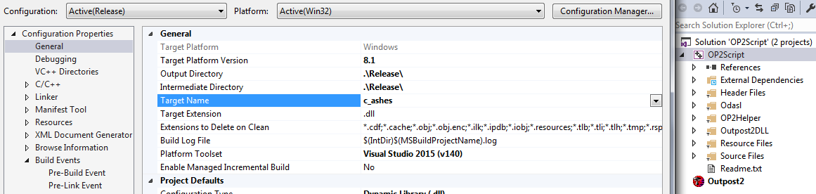 Visual Studio defaults to naming an executable or DLL produced from a project as the project's name. For example, the project OP2Script.vcxproj would produce the DLL OP2Script.dll. Outpost 2 enforces specific scenario naming conventions like reserved first filename characters, and seven characters or less (not including the extension) filenames. To prevent having to rename the file for testing every build and allow flexibility in naming your project, you can set the target name property of the project to specify a new output name for your dll.