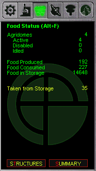 - Agridomes shows the total number of Agridomes in the colony. * Active provides the number of Agridomes that are Active. * Disabled indicates the number of Agridomes that are Disabled, regardless of cause. * Idled shows the number of Agridomes you have Idled. * Food Produced refers to the total amount of Food produced at all Active Agridomes. * Food Consumed shows the amount of Food consumed by the Colonists. * Food in Storage indicates the total amount of Food stored in the colony. * Added to Storage / Taken from Storage. If Food produced exceeds Food consumed, the difference is added to storage at the colony. Should Food consumed be greater than Food produced, this line will appear in yellow letters, and will represent the amount of Food taken out of storage to make up for the shortfall. * Food Shortage. Should the amount of Food produced and the amount in storage be insufficient to fill the colony's needs, this line, in red text, will appear, showing the amount of the Food shortage. * The STRUCTURES button takes you to a list of all Agridomes. The SUMMARY button returns you to the Resources report. - Go Back to Morale - Continue on to Power - Go Back to Rules Section —- - Go Back to Online Manual
