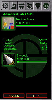 The Command Pane will change to the lab's Status display. After a moment, a progress bar will appear in the Status display, indicating how far research has proceeded. The ASSIGN button will allow you to return to the Assign display to change the number of Scientists assigned to the project. You might add Scientists to a project when they complete work at another lab or when they are trained at a University; conversely, you might remove Scientists from a topic if they are needed to operate a structure or to work on a more important topic at another lab. The STOP button will allow you to stop research in progress. When you stop a research project in progress, all work on that topic is lost.