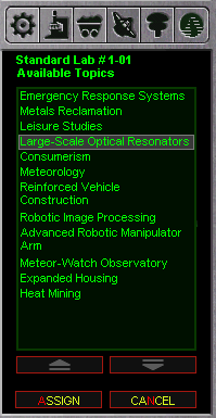 The list box in the Topics display shows all the products that your lab may currently research. (At times, there may be no topics available at a particular type of lab.) As you complete research on some topics, others may become available. Click the name of any topic to select it, then click the ASSIGN button. The Command Pane changes to show the Assign display.