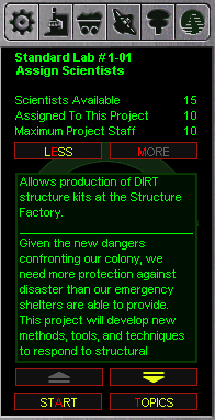Outpost 2 has three types of research laboratories: the Basic, Standard, and Advanced Labs. Doing research uses the same process regardless of the type of lab. Each lab's Status display has a TOPICS button, which is available any time the lab is Active and not already doing research. Click TOPICS. The Command Pane changes to show the Topics display.
